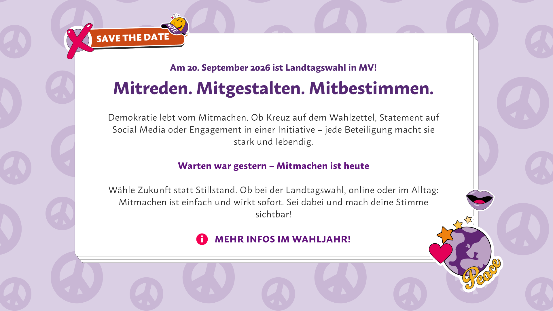 und geh wählen. Ob in Gesprächen, auf Social Media oder bei Veranstaltungen: Du bist